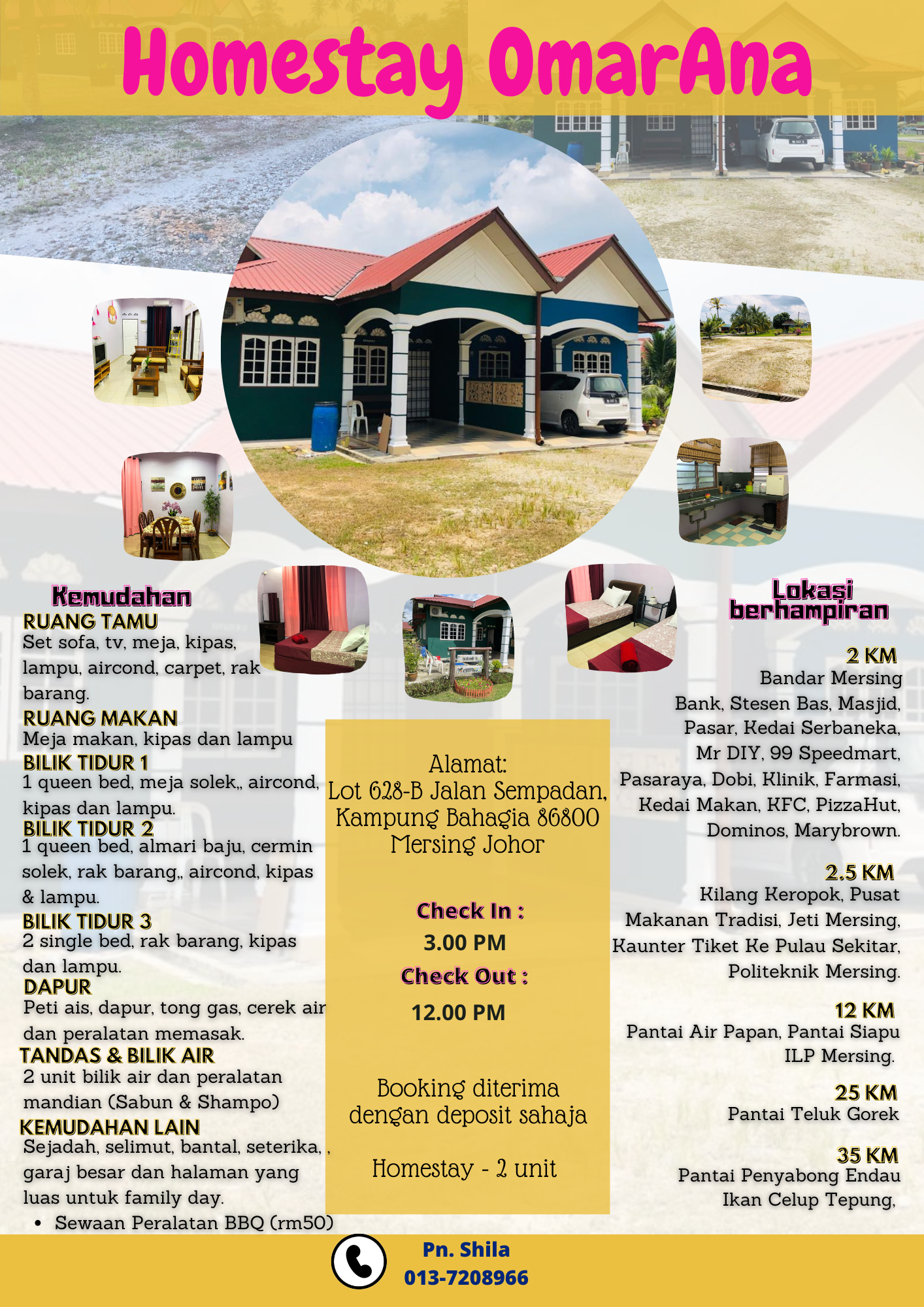 Untuk tempahan dan pertanyaan sila hubungi: Pn. Shila 013-7208966